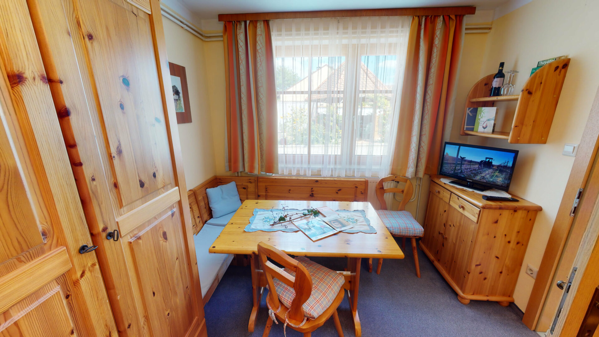 Unser gemütlicher Frühstücksraum. Eine ausgestattete Küche, gratis Wlan, ein Flat-TV und ein befüllter Weinkühlschrank laden zum Bleiben ein. Unser Stüberl ist ideal auch am Abend, um den Tag bei einem Glas Wein und gutem Gespräch ausklingen zu lassen. Zum spaßigen Zeitvertreib bieten wir Ihnen verschiedenste Gesellschaftsspiele an.
