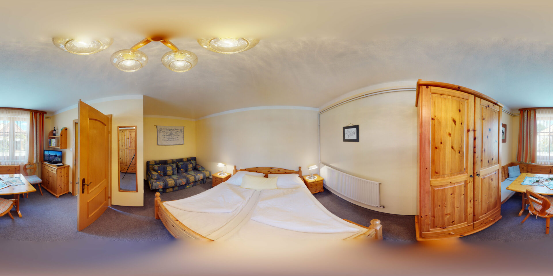 Unser Haus bietet 2 Unterkünfte an. Ein Gästezimmer und eine Ferienwohung. Die Basisausstattung beider Unterkünfte beinhalten: Vorraum, Zimmer mit Couch, Eckbank mit Tisch, TV, gratis WLAN, Sanitär: WC, Dusche